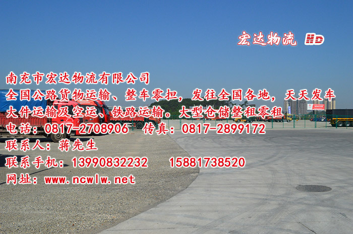 國(guó)內(nèi)公路貨物運(yùn)輸、整車(chē)、零擔(dān)、大件運(yùn)輸及空運(yùn)、鐵路運(yùn)輸。 專(zhuān)線:南充-廣州、深圳、浙江、上海、國(guó)內(nèi)每天發(fā)車(chē)往返。3-4天到達(dá)目的地。手機(jī):13990832232 15881738520